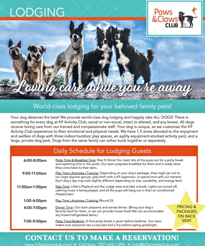 Food: Please bring your dog’s food from home, portioned and labeled with feeding instructions. If necessary, Paws and Claws Club food is available for $5 per day.